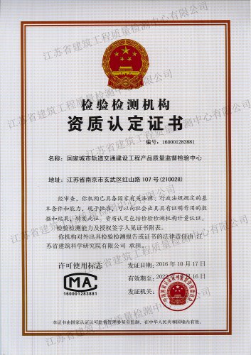 國家城市軌道交通建設(shè)工程產(chǎn)品質(zhì)量監(jiān)督檢驗(yàn)中心, 依托江蘇省建筑科學(xué)研究院和江蘇省建筑工程質(zhì)量檢測中心在城市軌道交通建設(shè)工程領(lǐng)域的綜合技術(shù)優(yōu)勢,于2016年10月獲得國家認(rèn)證認(rèn)可監(jiān)督委員會批準(zhǔn)授權(quán)..